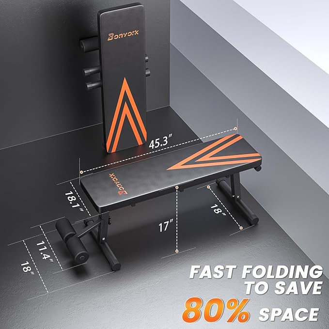 - 【Easy Installation & Space-Saving】Bonvork Flat Weight Bench is designed for easy installation and lightweight mobility. With all necessary tools provided, assembly can be completed in 3 minutes. Its compact design allows for convenient placement in any room, garage, or basement. The workout bench can be easily folded. You can fold it up against a wall or under a bed when you're not using it.