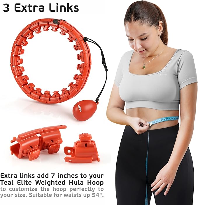 - Fully Adjustable: Each knot is 2.3 inches long, with three links adding a total of around 7 inches to your Teal Elite Weighted Hula Hoop. It will lengthen the the hoop to fit up to a 54" waist. Great for plus size.