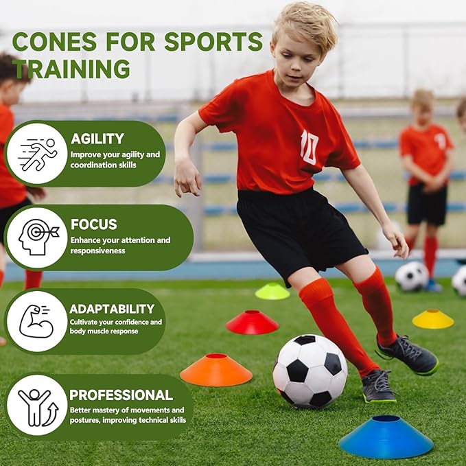 - [Multi-purpose Training Tool]: The marker cones is a multifunctional training device for various sports such as football, rugby, basketball, and agility training, which can help improve training by improving performance, speed, and footwork.