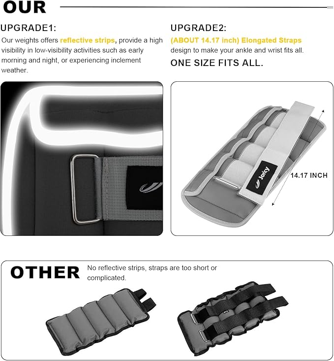- [UPGRADE Feature 1]: Our ankle weights 5lb each weights offers reflective strips details across the surroundings. Providing you a high visibility in low-visibility scenes and activities such as early morning and night, or experiencing inclement weather.