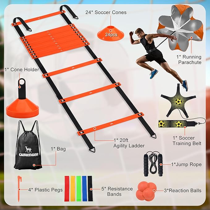 • Agility Training Equipment Kit: Includes 20 ft 12 rungs no tangle fixed-width agility ladder with fixable 4 stakes, resistance parachute, 24 yellow disc soccer cones with cone holder, 5 resistance bands, 3 reaction balls, solo soccer trainer belt, and jump rope.Whether you are a beginner or an expert, the speed training equipment can meet your training requirements