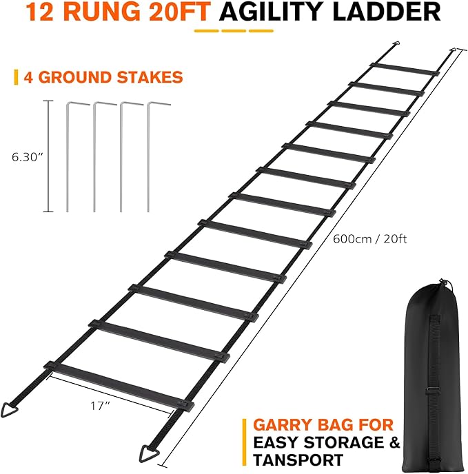 • 【Transform Your Workouts】- Elevate your fitness routine with our all-inclusive soccer ladder set. Designed to push you to new limits, this set includes a 20ft speed ladder with 12 adjustable rungs, 4 steel stakes for stability, and a convenient carry bag for on-the-go training.
