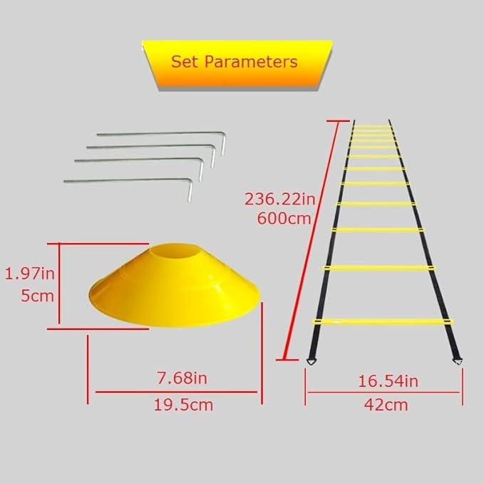 • 【Agility Ladder Training Kit】It includes a 12 rungs 20Ft agility ladder, 1 running resistance parachute, 4 Hurdles, 12 disc cones, 4 steel stakes, 5Pcs resistance bands, 1 Skipping Rope, and 1 storage bag.
