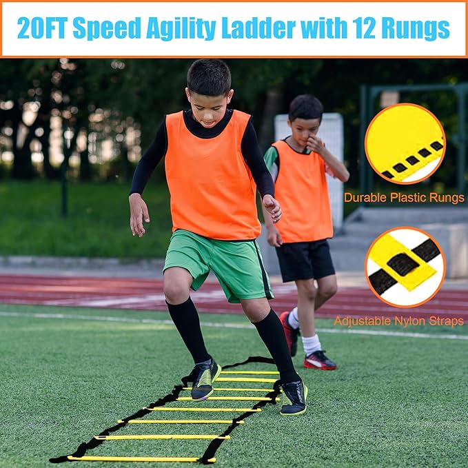 - Agility Training Equipment Set - Football agility training set includes: 1 Yellow Speed Training Ladder(20ft long 12 rungs) with 4 Fixable Stakes, 4 Blue Adjustbale Hurdles Training Equipment, 12 Blue Soccer Cones, 1 Running Parachute Speed Training, 1 Jump Rope, 5 Exercise Bands and 1 Carry Bag. Great football soccer basketball training equipment for youth.