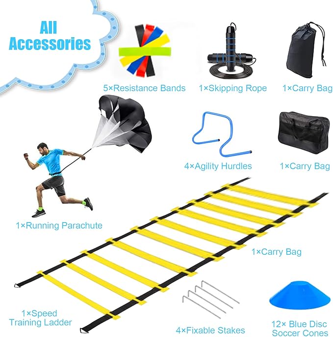 - Agility Training Equipment Set - Football agility training set includes: 1 Yellow Speed Training Ladder(20ft long 12 rungs) with 4 Fixable Stakes, 4 Blue Adjustbale Hurdles Training Equipment, 12 Blue Soccer Cones, 1 Running Parachute Speed Training, 1 Jump Rope, 5 Exercise Bands and 1 Carry Bag. Great football soccer basketball training equipment for youth.