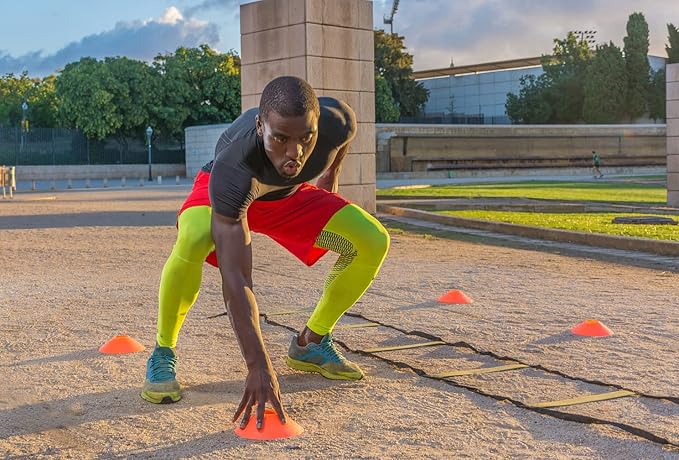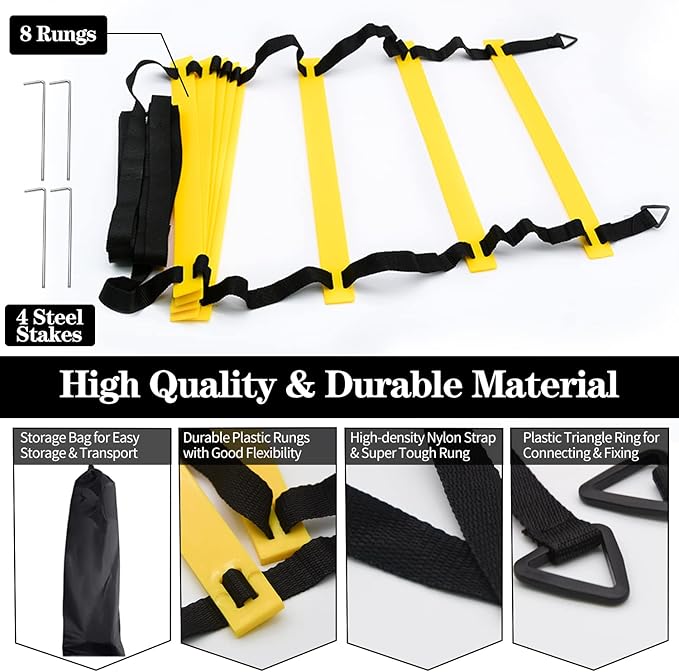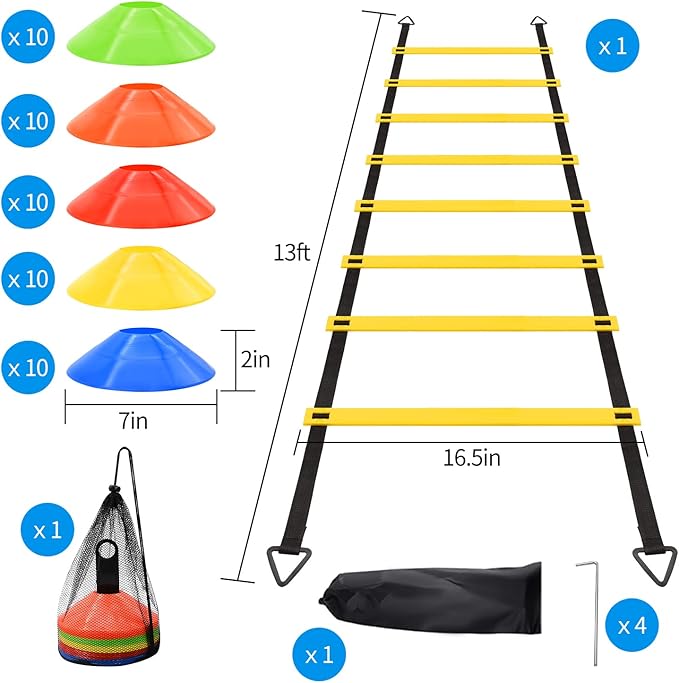 - 【Ladder & Cones Set】- You will get an 8 rungs 13ft agility ladder, 50pcs 5 colors cones, 4 steel stakes, 1 cone holder, 1 cone carry bag and 1 ladder carry bag. This agility ladder set is a must-have for improving speed, leg strength, endurance, agility, coordination, quickness and overall athletic performance.