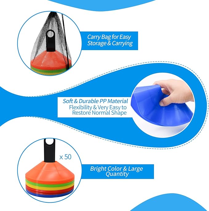 - 【50pcs Disc Cones】- 50pcs field cone markers with 1 cone holder and 1 carry bag, cones are 5 colors (yellow, blue, green, orange, red). Cones are made of new high quality PE material, they are thicker, more flexible and longer lasting. Disc cones have super toughness, they are not afraid of being trampled by mistake, not easy to break, very durable and can be used repeatedly.