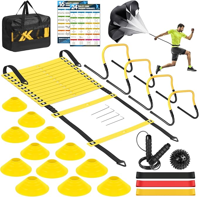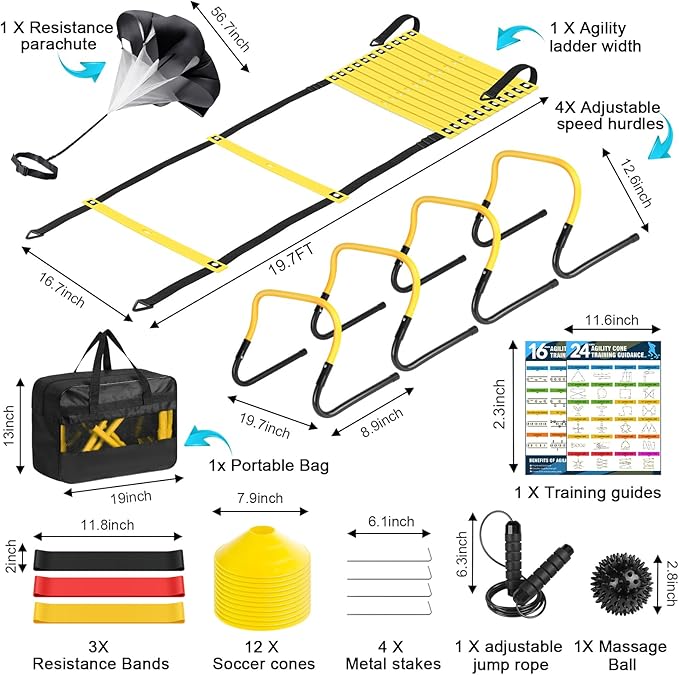 - " Comprehensive Agility Training Equipment Set " - The agility training set includes a 20-ft high-strength nylon agility ladder with soft and durable PE rungs, 4 adjustable-height ABS agility hurdles, 12 durable PE soccer training cones, 1 high-resistance running parachute, 1 professional jump rope, 1 spiked ball 3 latex leg resistance bands (15, 25, 35LB), and a detailed instruction manual. Whether you are a beginner or an expert, this agility training equipment meets all your training needs.