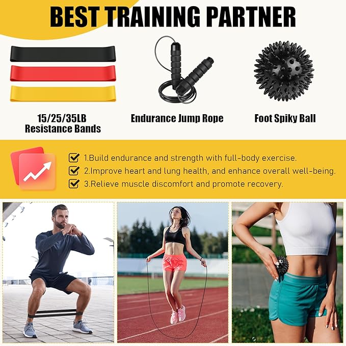 - " Unlock Your Potential" - This set is perfect for various leg training exercises including soccer, football, basketball, and baseball. It also allows for the creation of fun obstacle courses for both kids and adults, enhancing training potential. The spiked ball aids in post-training foot muscle relaxation and massage, reducing the risk of injury. The resistance bands (15, 25, 35LB) are made of skin-friendly latex, suitable for crab walks and squats to promote targeted muscle growth.