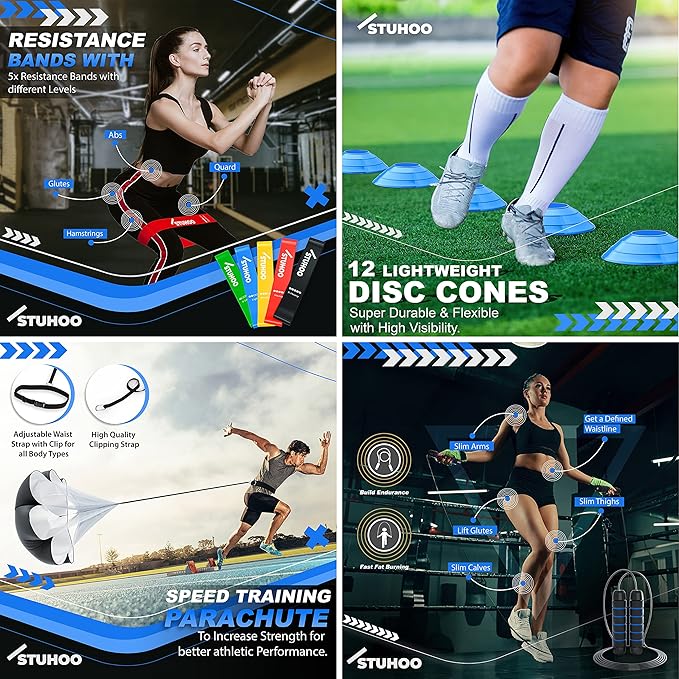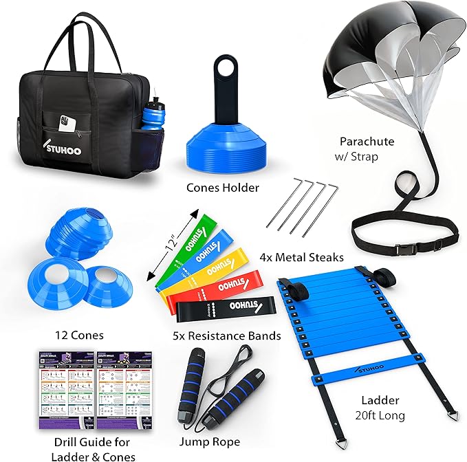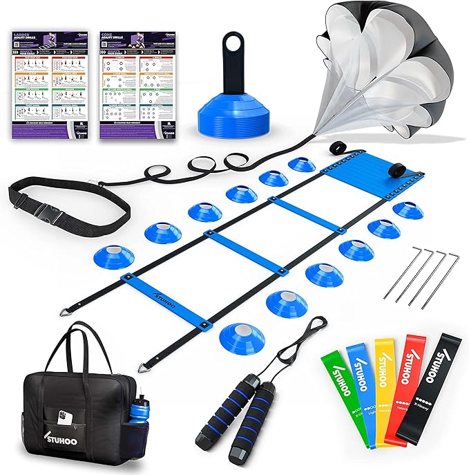 - 【The Perfect Agility Training Equipment Set】: STUHOO brings a versatile soccer training equipment that includes 20 ft Agility Ladder, Parachute for speed training, Jump Rope, 5 Resistance Bands, 12 Disc Cones with holder, 2 Double-Sided Drill Guides, & Polyester Gym Bag; our football training equipment comes with a passion to make your life more fitter