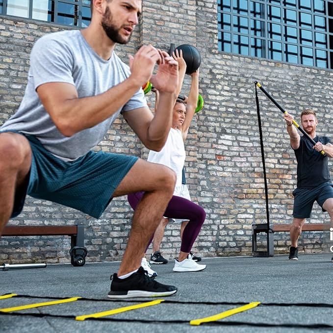 - Versatile Training Set: Includes 20-foot agility ladder, 12 yellow cones, 4 stakes, and 5 resistance bands for comprehensive speed and agility drills.