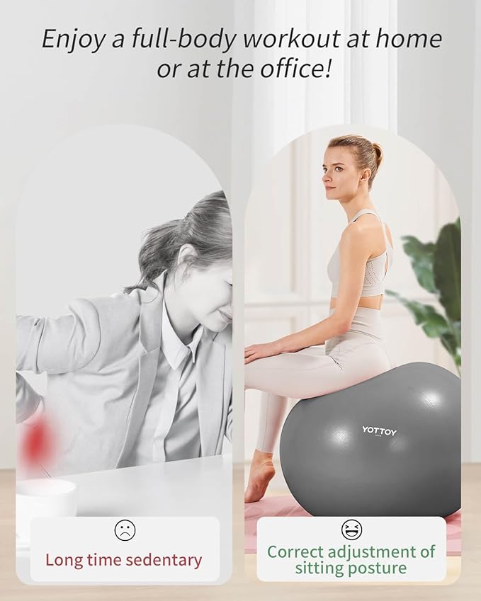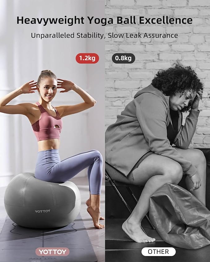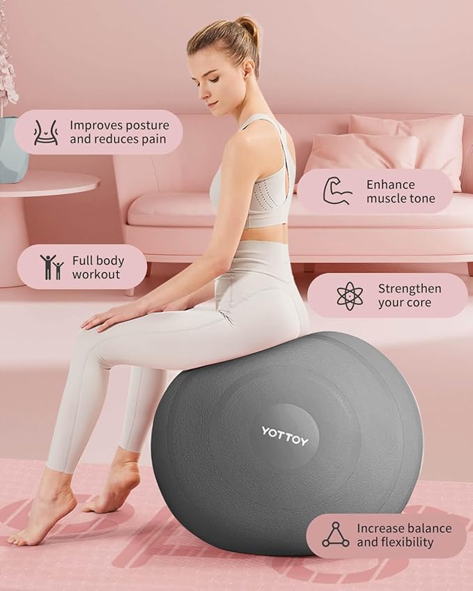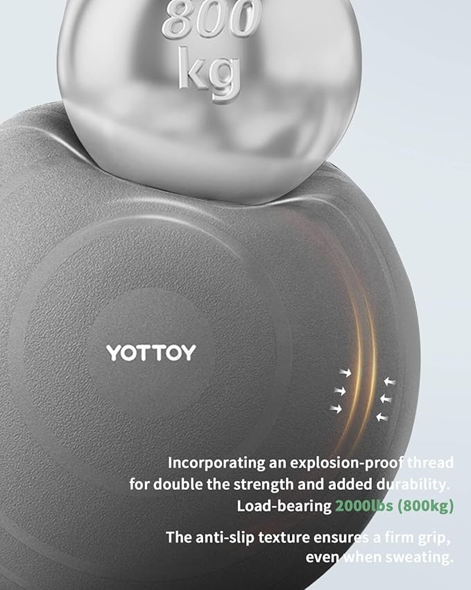 - Our workout balls for exercise features a surface design that is exclusive to our YOTTOY brand, incorporating an explosion-proof thread for double the strength and added durability. Additionally, we have improved the anti-slip texture to ensure a strong grip, even when sweating. With its sturdy construction, you can trust that our fit ball won't pop out during your workouts. Elevate your yoga practice today with our top-of-the-line sitting ball!