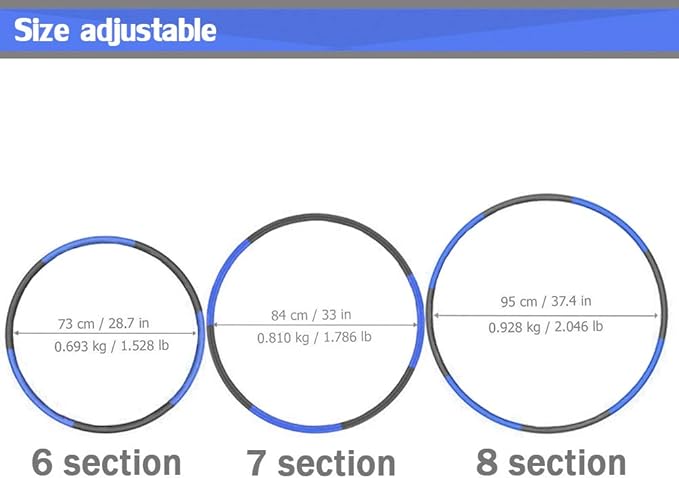 - SIZE ADJUSTABLE: according to your figure it can be adjusted. The package contains 8 sections, 1.9 pounds and measures 38 inches wide. Remove 1 or 2 sections, set up 7 or 6 sections hoop.