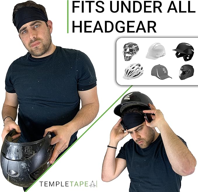- Super slim & Lightweight (weighs less than half an ounce) | Perfect to be worn on their own or under hats, football helmets, hard hat and visors | Stretchy, breathable material, allows the Temple Tape to fit virtually every head size and shape - Throw away those outdated bandanas & gift yourself a Temple Tape!