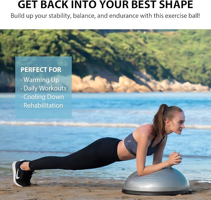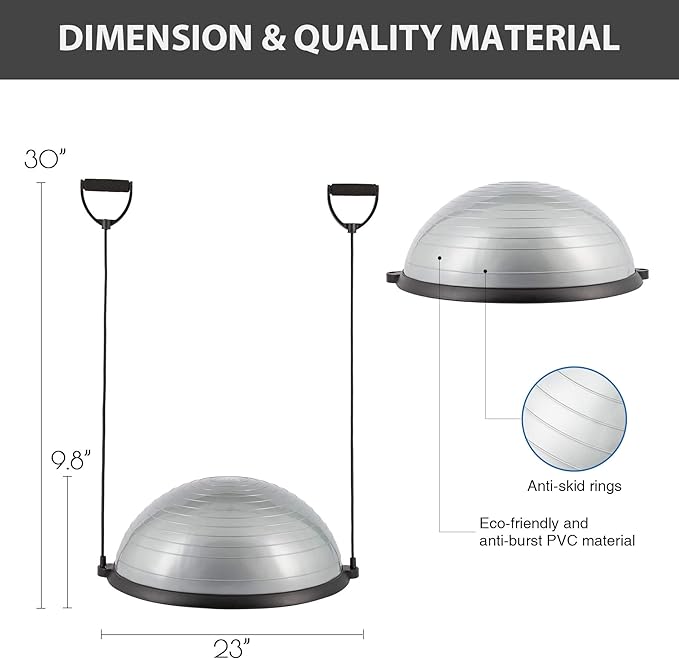 - BALL PUMP INCLUDED: A complete combo, this half-dome stability ball comes with a complimentary foot pump that makes it easy to get fully inflated to 9.8” in under 5 minutes. The ball’s high-quality air valve prevents air leakage and extends service life