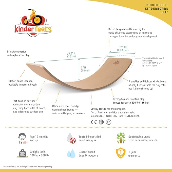- INTENTIONALLY-DESIGNED: Crafted to ensure long-lasting use and durability, each board is manufactured to support active and imaginative free-play for tiny tots up to 300 lbs (136 kg). Dimensions include 27.5” L x 4” W x 3” H (70 x 10 x 7 cm). Suitable for children ages 12 months and up, the Kinderboard LITE is designed for small children to easily maneuver and handle. This durable Montessori furniture is a solid heirloom item can be used for many years of adventure.