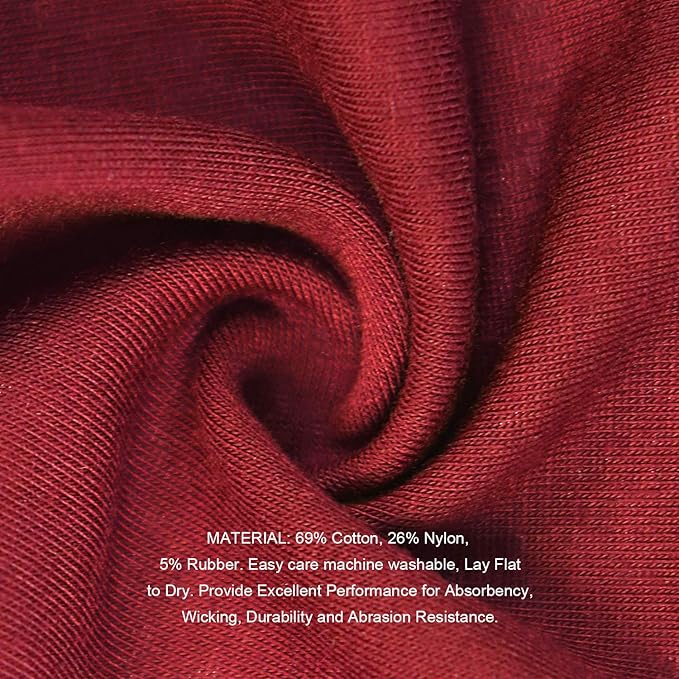 - MATERIAL: 69% Cotton, 26% Nylon, 5% Rubber. Easy care machine washable, Lay Flat to Dry. Provide Excellent Performance for Absorbency, Wicking, Durability and Abrasion Resistance.