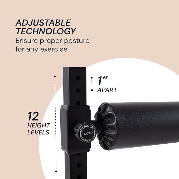- Adjustable And Adaptable: Our home gym equipment, the ideal one leg squat stand features 12 adjustable height levels, each separated by 1 inch, catering to both beginners and experienced athletes. This Bulgarian squat stand evolves with your fitness progress