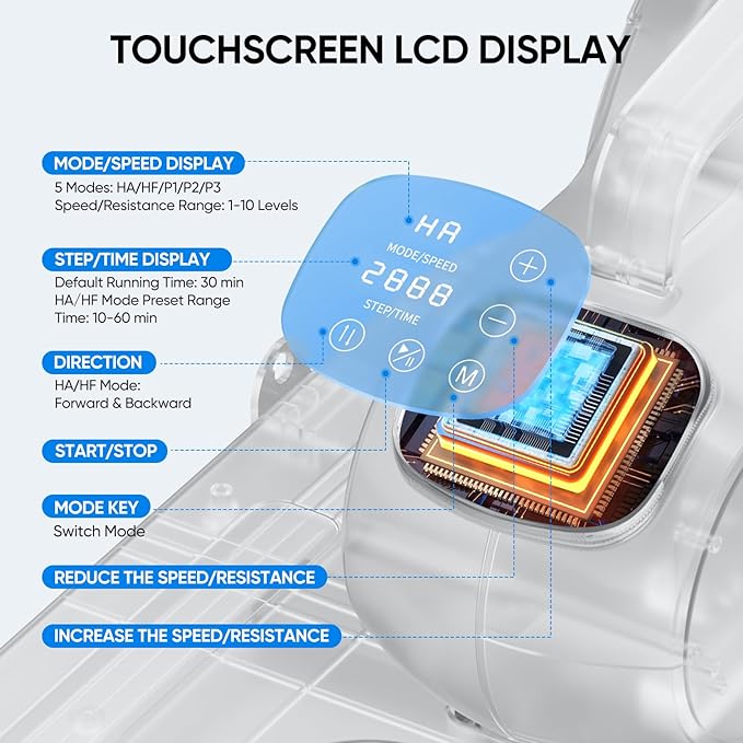- 【Touchable LCD Digital Screen】The high-definition LCD digital screen displays real-time data such as exercise speed and time comprehensively records your exercise status, and lets you control your exercise plan better. We have also equipped the display with a touchscreen function, so you can adjust the exercise mode you want with just a light touch