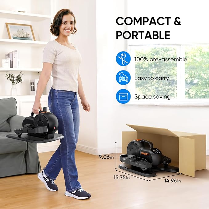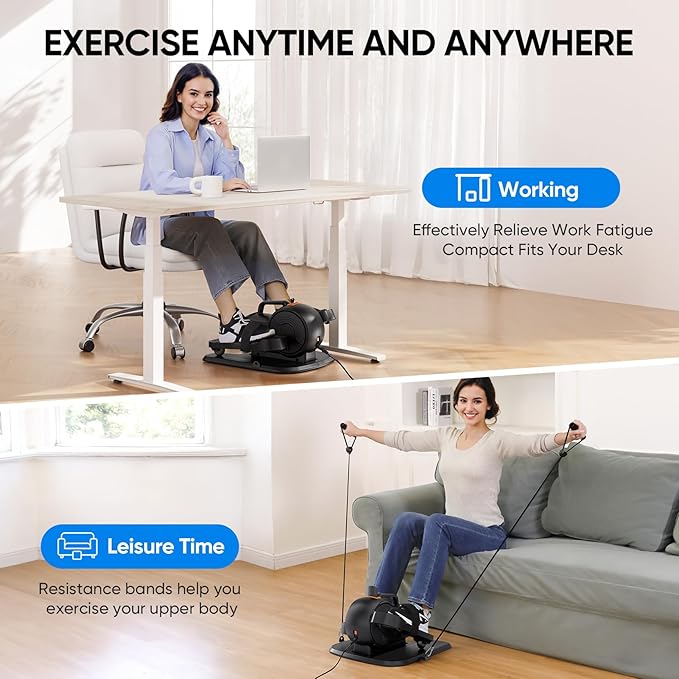 - 【Humanized Design】 The compact and portable design is easy to store. The adjustable foot straps can secure your feet and enjoy a safe workout. One-touch switch, no need to repeatedly plug and unplug the power cord, more convenient and safer. We also equipped it with a resistance band, so that you can exercise your upper body muscles properly while sitting and exercising your legs. The anti-skid pad at the bottom of the elliptical machine can also prevent the machine from sliding during exercise