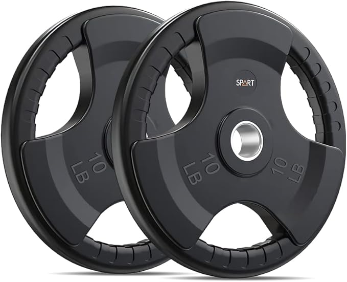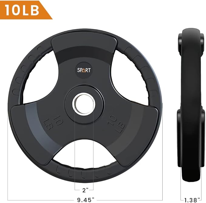 - 💪FEATURE: SPART weight plates have a solid iron core and slide rubber surface. This design can protect the floor from damage and ensure enough weight when you do exercise. The strong steel ring insert can help you assembly the barbell easily. The three holes are designed for grip according to your hands and you can do weightlifting exercise with single plate as well.