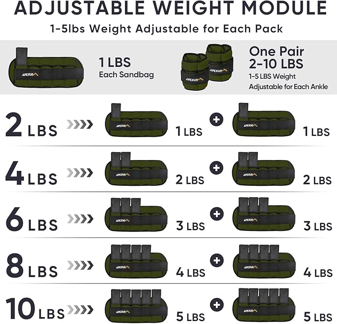 - [PREMIUM QUALITY] APEXUP adjustable ankle strength training weights are filled with iron sand to ensure a compact profile. The sleeve material of the ankle weights for men is soft and breathable, which will give you maximum comfort during workout.