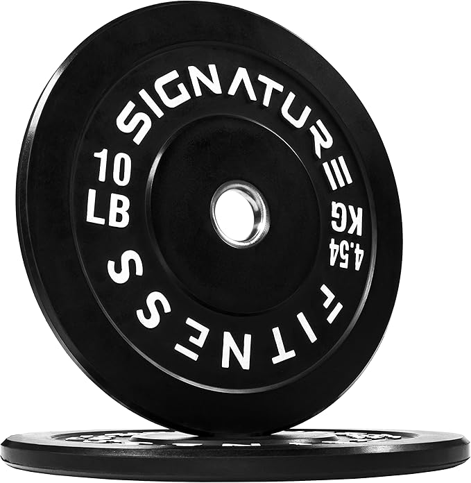 • 100% VIRGIN RUBBER - LOW ODOR AND BOUNCE - Signature Fitness Bumper Plates contain NO recycled rubber. This means low to no odor, guaranteed durability, and low "dead" bounce for safety.