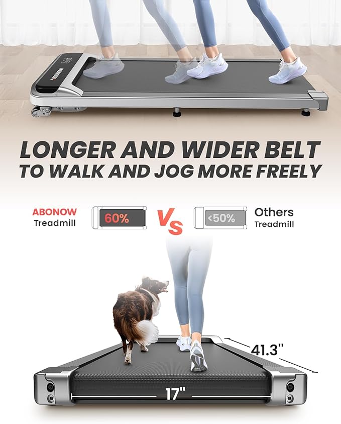 - [Wide Non-slip Running Belt] Five layers of non-slip running straps This running machine combines a compact size and lightweight build with an expanded running belt size, providing a wider and longer surface area. With dimensions of 17*41.3 inches, it eliminates the cramped feeling while walking or jogging, making it the perfect choice for home office use!