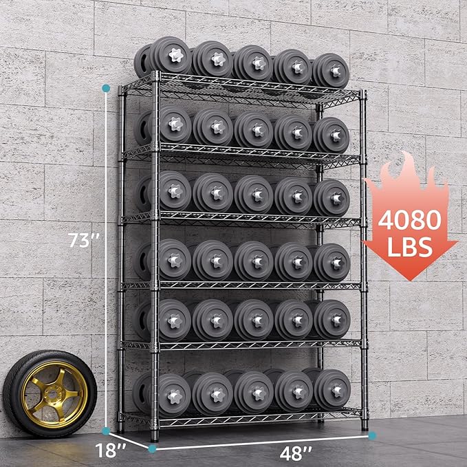 - 【STABLE AND DURABLE】Crafted from premium Carbon Steel and reinforced with 25.4mm pipes, this wire shelving unit (17.7"D x 47.2"W x 72.3"H ) ensures stability. Each shelf showcases a weight-bearing capacity of 680 pounds, while the entire unit can support up to 4080 pounds on feet/600 pounds on wheels.