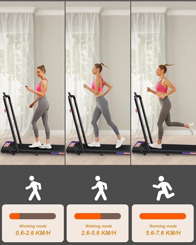 - 2024 UPGRADED 2-IN-1 FOLDING TREADMILL: 2 -in -1 folding treadmill with two exercise modes. Walking mode speed range is 0.6-3.8mph, and running mode speed range is 0.6-7.6MPH. This allows the treadmill to adapt to your personal exercise needs, whether low- speed walking or high- speed running.