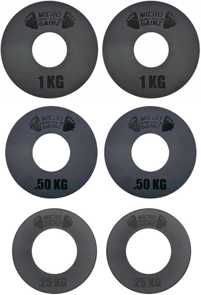 Micro Gainz Olympic Kilogram Fractional Weight Plate Set of 6 Steel Plates- (2-.25KG, 2-.50KG, 2-1KG) Plates -Designed for Olympic Barbells, Used for Strength Training and Micro Loading, Made in USA