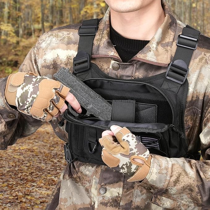 - Quick Access & Chest Holster for Pistol: The chest bag includes a pistol holster and a US flag patch(replaceable). The holster can accommodate most sizes of pistols, and the spacious main pocket can easily accommodate a pistol and 2 magazines, which can be quickly opened this chest bag and used in dangerous places.