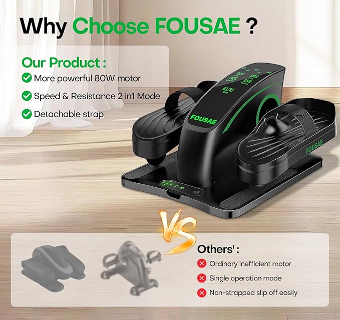- Upgraded High-Performance Elliptical Machine: FOUSAE Under Desk Elliptical Added 6 adjustable resistance levels with 15 speeds, 2 workout modes - Forward & Reverse motion. Powered by an 80W ultra-smooth, whisper-quiet motor, it includes a large HD LED display(with breathing light) and remote control, removable pedal straps, and portable handles for easy mobility. 100% pre-assembled and ready to use, FOUSAE delivers a stronger, smoother, longer-lasting, and more comfortable workout experience