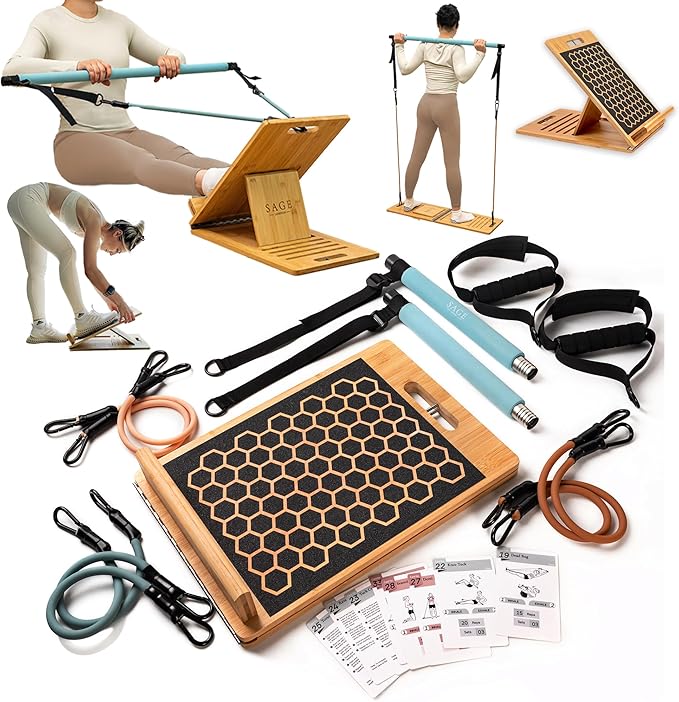 - ☽ Your All-in-One Home Workout Kit Experience full-body workouts with Sage London’s elegant 3-in-1 Pilates kit for home workouts - featuring a bamboo slant board, Pilates bar kit with resistance bands, and 54 illustrated exercise cards. Sculpt, stretch, and strengthen from the comfort of your home - no gym required.