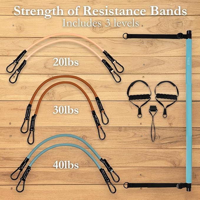 - ☽ Pilates Bar Kit with Adjustable Resistance Bands Includes 3 sets of resistance bands (20, 30, 40 lbs) and a smooth-finish Pilates bar to help you tone glutes, define abs, and build upper body strength. Mimics reformer-style workouts without the studio price. Perfect pilates set for pilates at home, strength, and flexibility exercises.