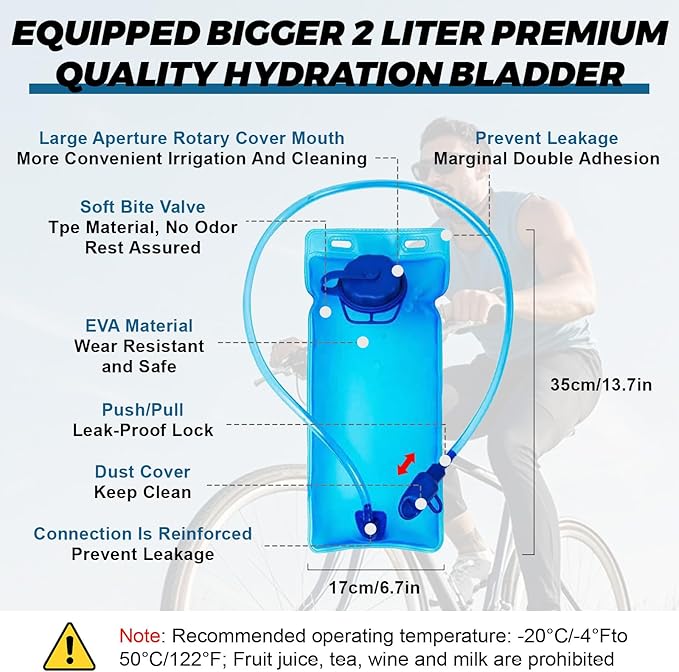 - đŠăQuality water bag configurationă Hazxh running vest equipped with 2*2L food grade water bag, water filling is easy and convenient, water pipe is easy to clean. Steady output of healthy water flow (40 inches /100 cm long, 0.4 inches /1 cm diameter), carefree drinking, suitable for -20 ~+50°C water temperature, to meet a variety of outdoor drinking needs.