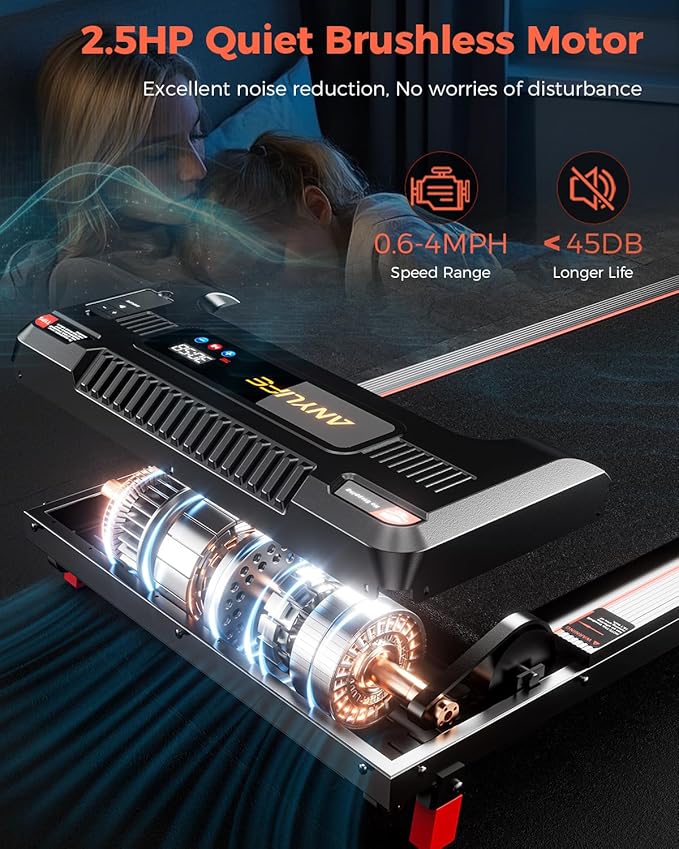 - 2.5HP BRUSHLESS MOTOR:This under desk treadmill is equipped with a 2.5HP high power brushless motor that produces no more than 45dB of sound when running, so you can enjoy your workout late at night or early in the morning without disturbing others, can load a max weight up to 330lbs capacity