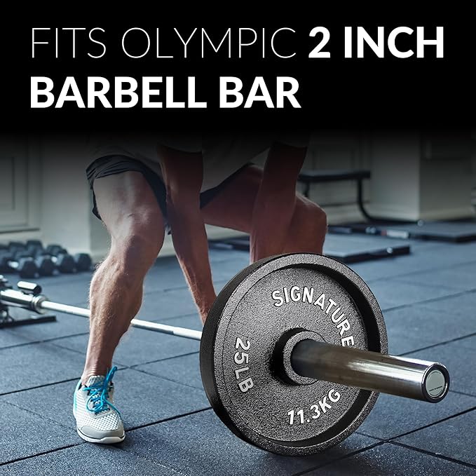 - OLYMPIC STYLE PLATES – Constructed of Solid Cast Iron with a 2-inch machine drilled hole and durable Silver Enamel finish. Simple, classic, and tough enough to endure a rock-solid workout! Note: Each weight plate has a 2-inch center hole diameter that is designed to fit on standard Olympic Barbells.