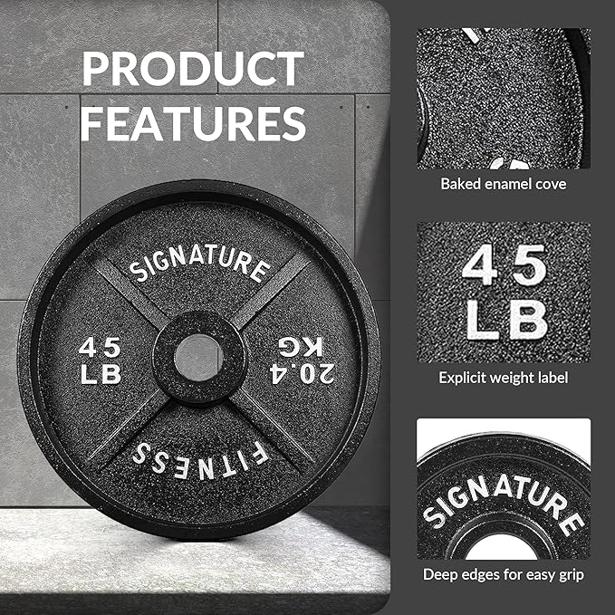- OLYMPIC STYLE PLATES – Constructed of Solid Cast Iron with a 2-inch machine drilled hole and durable Silver Enamel finish. Simple, classic, and tough enough to endure a rock-solid workout! Note: Each weight plate has a 2-inch center hole diameter that is designed to fit on standard Olympic Barbells.