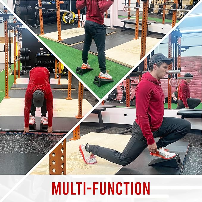• Anti-Slip Design - The surface of the wedge is coated in a course grip tape, which allows for use barefoot, with socks or shoes and rubber bumpers on the underside keep the squat ramps from sliding on the floor.