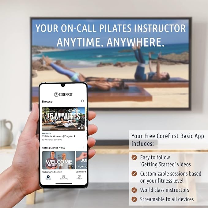 • ✔️TOP RATED APP! Corefirst Basic App is included and has dozens of easy-to-follow videos covering set up, getting started tips and Pilates workout fundamentals for beginners. Best of all, it comes with 15-40 minute Pilates workouts led by 1st class Instructors in beautiful locations and even includes sample Corefirst Stretch, Strength and Burn (cardio) workouts! Every purchase also includes a free 14-day trial of the All-Access Premier Membership.