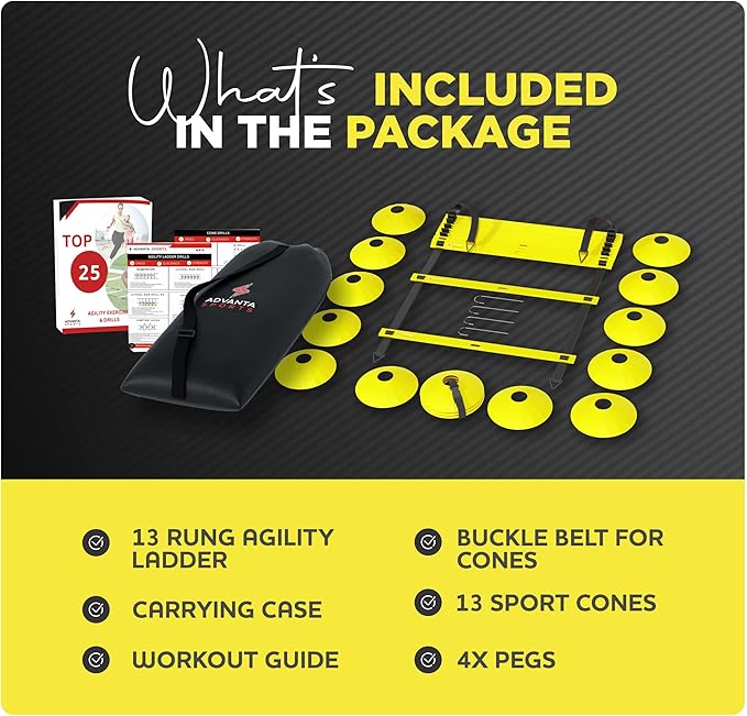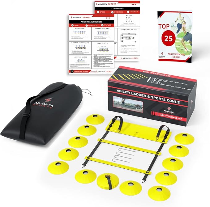 • ✅ PREMIUM AGILITY LADDER SET – The 21-foot agility ladder, 13 cones, 1 carry bag, & 4 stakes are all part of the ADVANTA SPORTS Agility Ladder Training Set. Everything is included to increase your explosiveness, agility, speed, &fitness. Designed for: football equipment, boxing training equipment, agility ladder and hurdles, football ladder, speed and agility training equipment, soccer practice equipment, basketball equipment training, speed ladder agility ladder, soccer coach, soccer trainer.