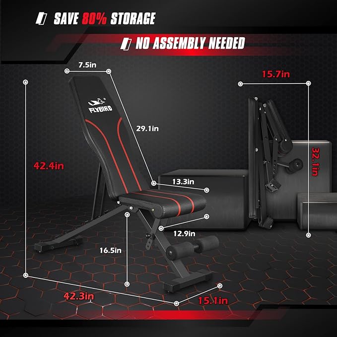 - Save 80% Space: FLYBIRD foldable bench, easy to carry & NO ASSEMBLY NEEDED, folded size: 31.5" L x 12.6" W x 11.8" H; You can put it in the corner, closet, or under the Bed when you finish workout