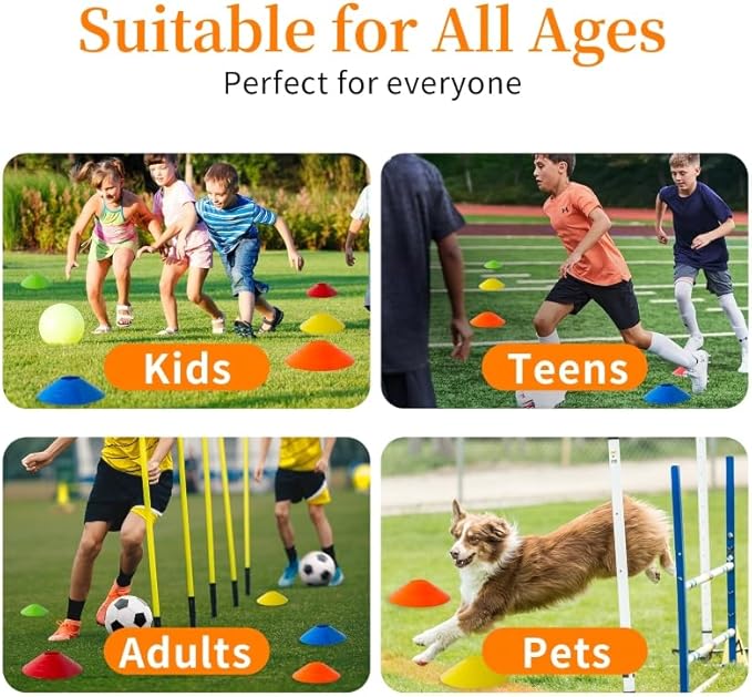 - 【Durable, Safe & Flexible】Our upgraded agility cones are designed for football practice, basketball training, and more. These lightweight yet strong cones won’t crack or fade, featuring bright, easy-to-see colors with UV protection. Ideal for cones for soccer practice, agility cones, and soccer cones for kids.