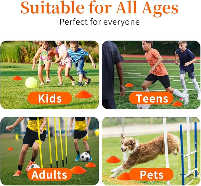 - 【Durable, Safe & Flexible】Our upgraded agility cones are designed for football practice, basketball training, and more. These lightweight yet strong cones won’t crack or fade, featuring bright, easy-to-see colors with UV protection. Ideal for cones for soccer practice, agility cones, and soccer cones for kids.