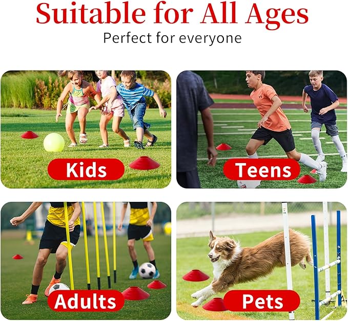 - 【Durable, Safe & Flexible】Our upgraded agility cones are designed for football practice, basketball training, and more. These lightweight yet strong cones won’t crack or fade, featuring bright, easy-to-see colors with UV protection. Ideal for cones for soccer practice, agility cones, and soccer cones for kids.
