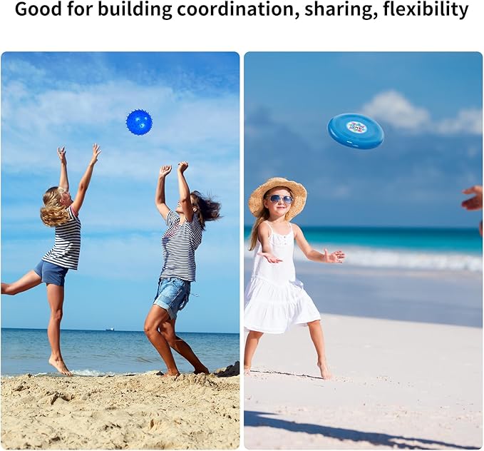 • Knobby balls is for building coordination, sharing, flexibility.Bounce ball measures approximately 7" in diameter after inflation and the flying disc with a 9. 5" diameter, which perfectly to use at a courtyard