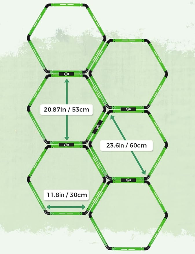 - 6 Set GHB Hexagonal Agility Rings: This package includes 6 set agility hexagon rings, each separate ring has a 21” diameter. 5 connectors for each rings to be connected. Premium agility training equipment for footwork basketball training