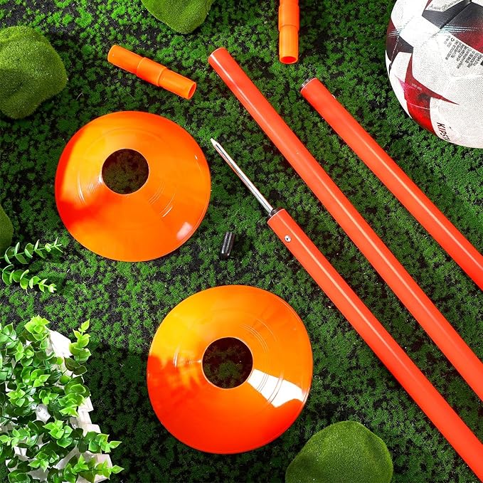 - Quality Material: the agility poles are made of sturdy ABS material, which is known for its strength and durability; This material is also resistant to impact, making it ideal for rigorous training sessions; The sports cones for drills are made of plastic, which is also long lasting; Both materials are designed to withstand the wear and tear of regular use, ensuring that the equipment will last for years to come