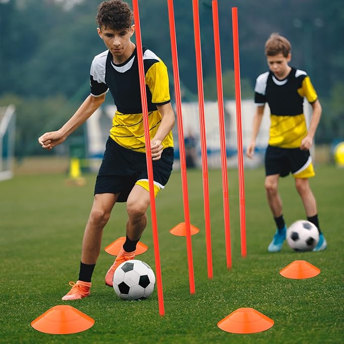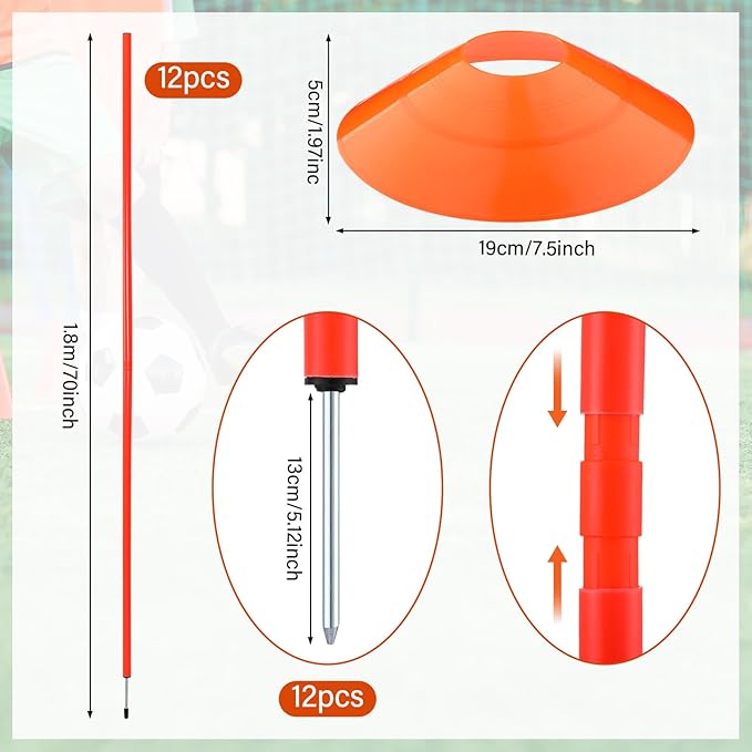 - Ample Quantity: this set includes 12 soccer training poles and 16 agility cones, providing enough equipment for a variety of training drills and exercises; With this set, athletes can create training programs that are tailored to their specific needs; The quantity makes it easy to set up multiple training stations, allowing for efficient use of time during training sessions; Whether you are an advanced athlete or a beginner, this set will help you improve your training goals in the short term